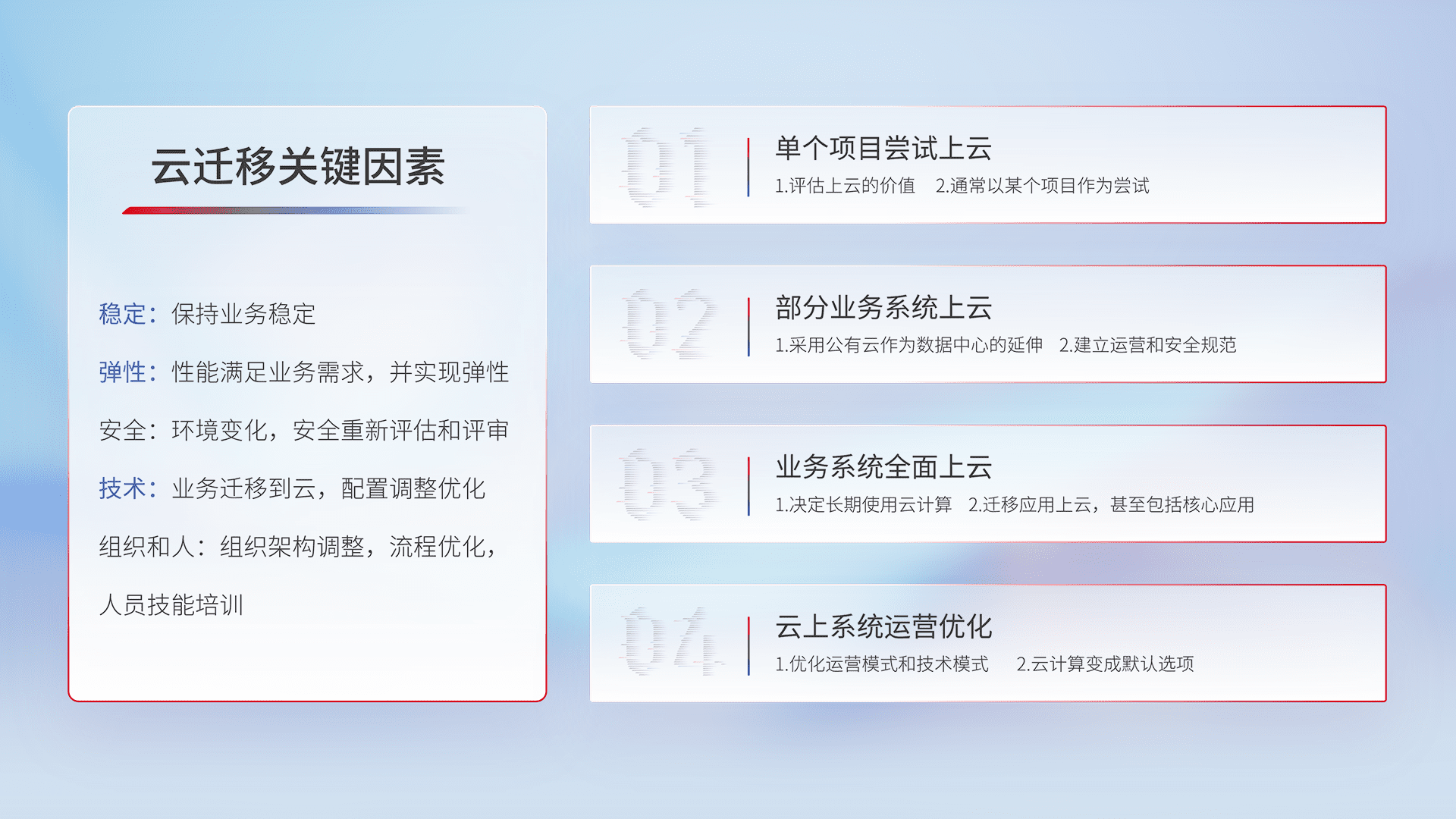 结合实际业务,,,,从规划设计、、、、云平台选型、、、云原生改造、、数据迁移、、集成交付,,迁移全过程为客户识别最佳上云路径,,,,做好风险识别管理,,设计网络架构、、、、身份权限、、、安全审计合规、、、操作审计、、、、日志审计、、、、监控告警策略、、、、多站点容灾设计等,,对云上基础设施进行整体规划,,提升IT治理水平,,,,以满足弹性、、、、高可用、、、、高性能的需求。。。