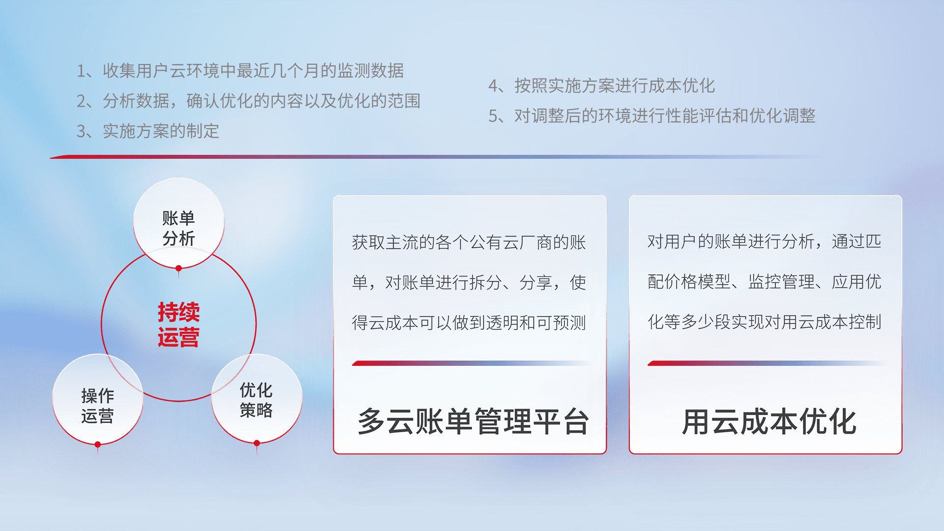 通过多云纳管,,,以统一的资源数据模型把客户的云资源进行抽象和封装,,进而实现对多云资源的统一操作,,,保障云资源管理的可靠性、、、稳定性与可用性。。。。量身定制化运维内容,,,,配置、、、开发运维、、、、补丁管理、、、、备份、、、、监控、、、、认证和访问管理、、、、审计和日常巡检等,,保障在用云过程中的可靠度,,,,稳定度以及高可用率。。。